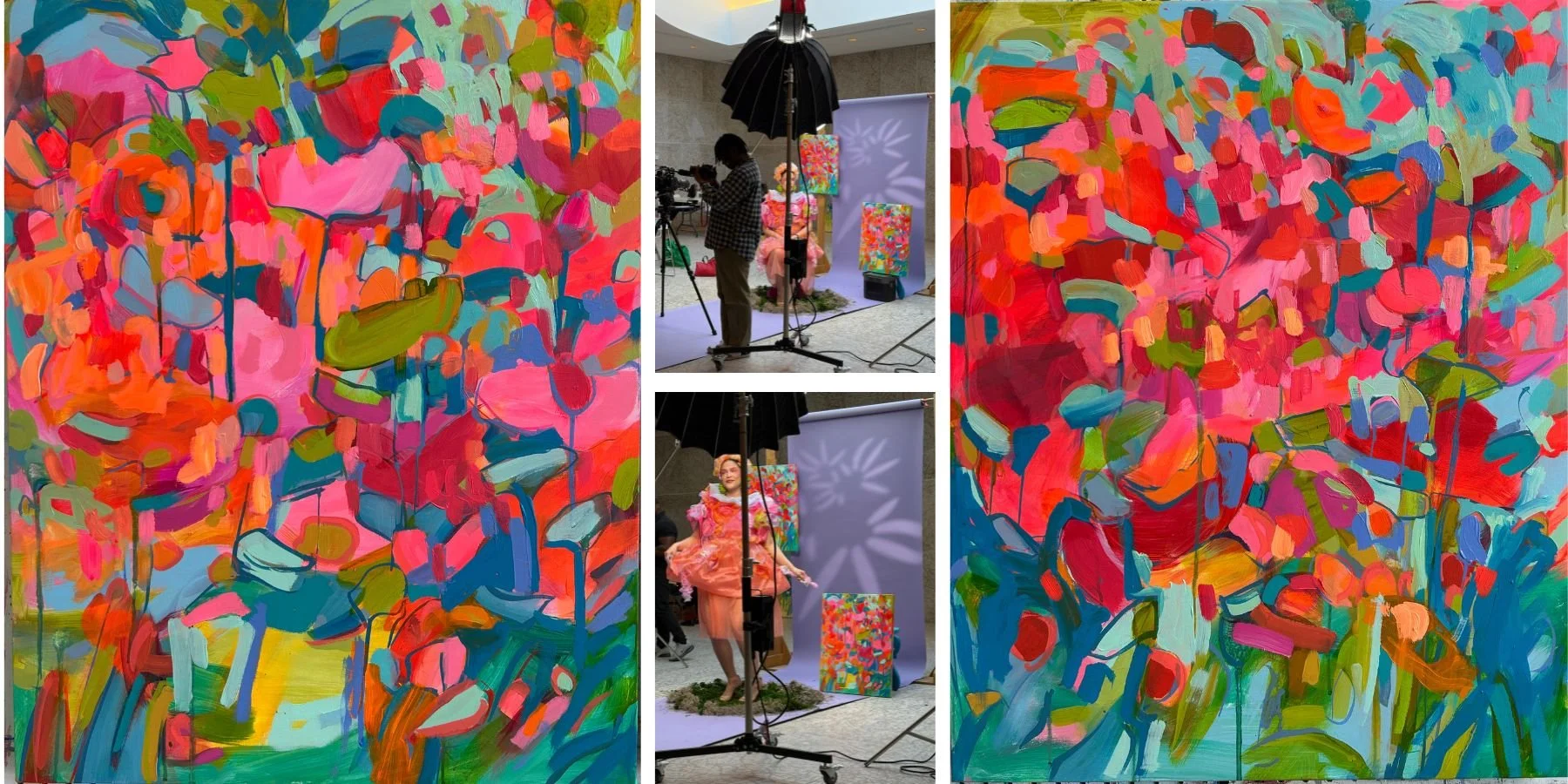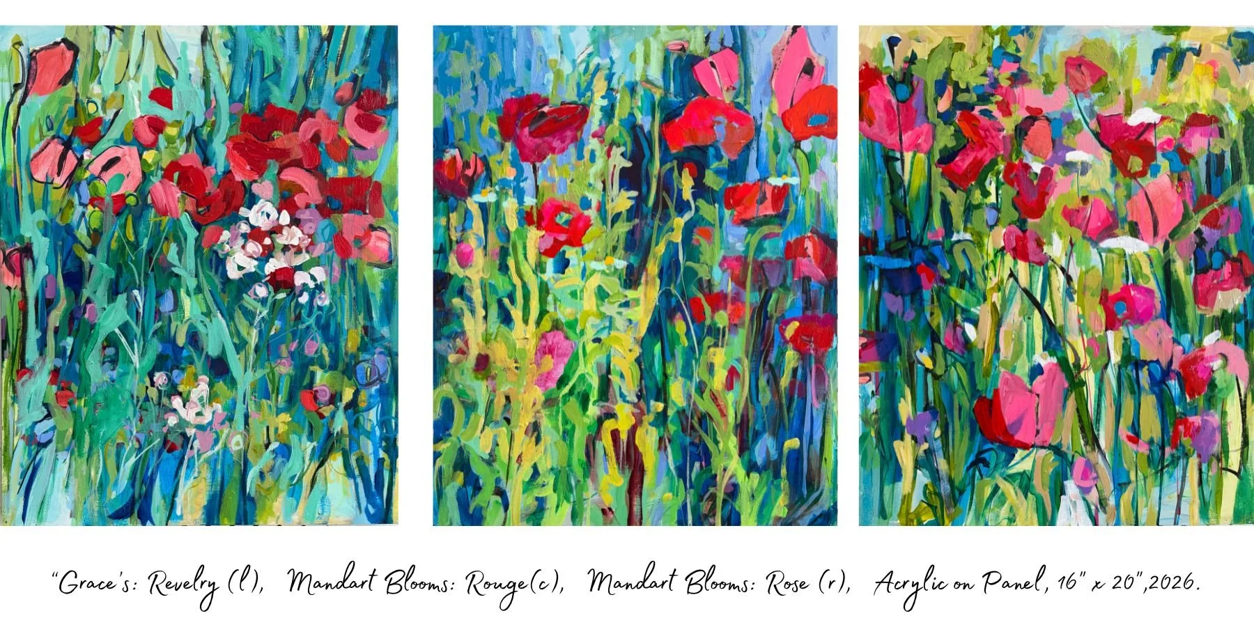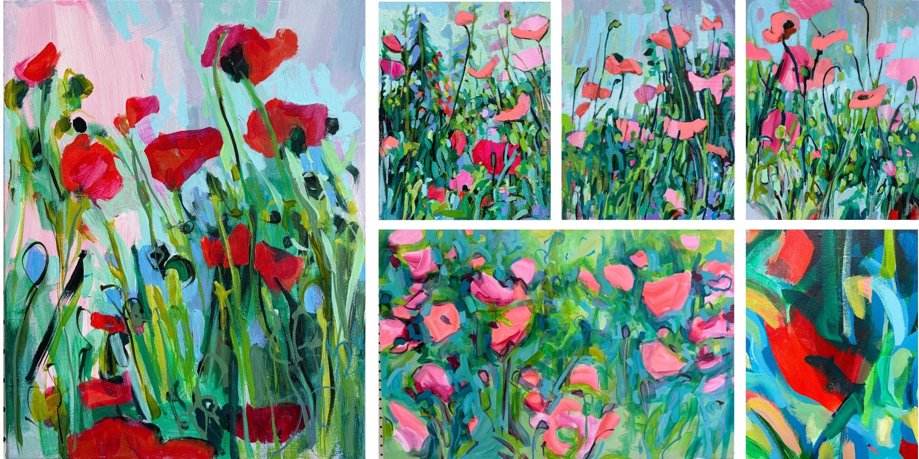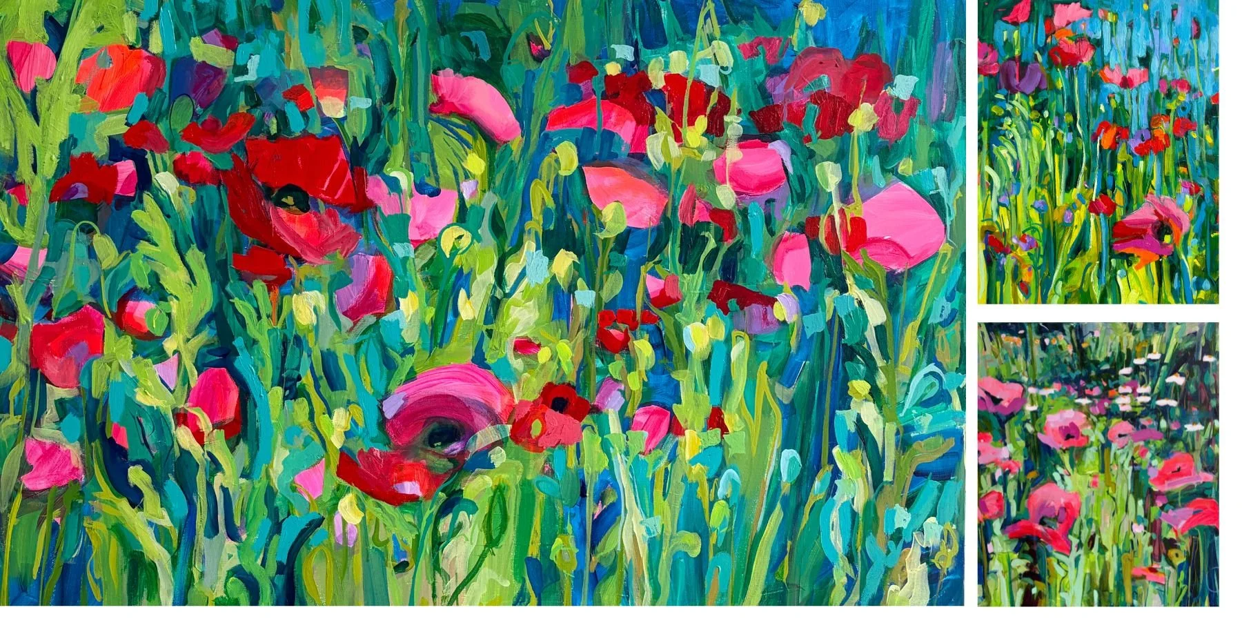 “Poppies: Ensemble”, 24” x 36”, left. “Sweet Treat: Carnival, 11” x 14”, top right, detail, “Sweeter Treat: Joy”, 20” x 20”, bottom right.