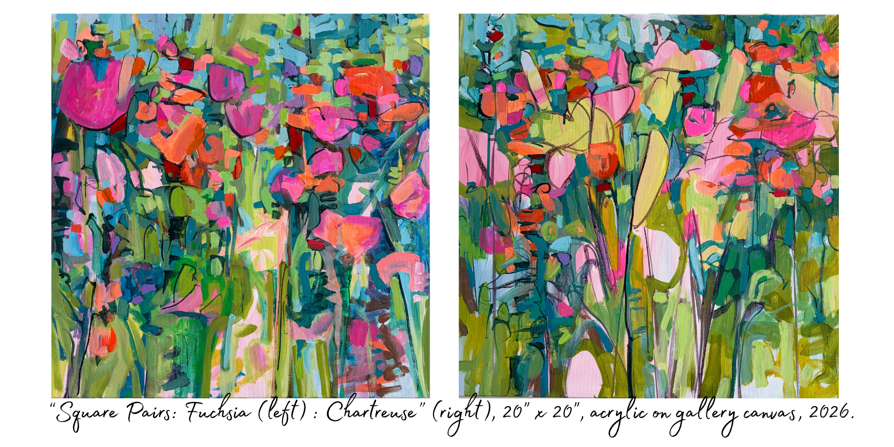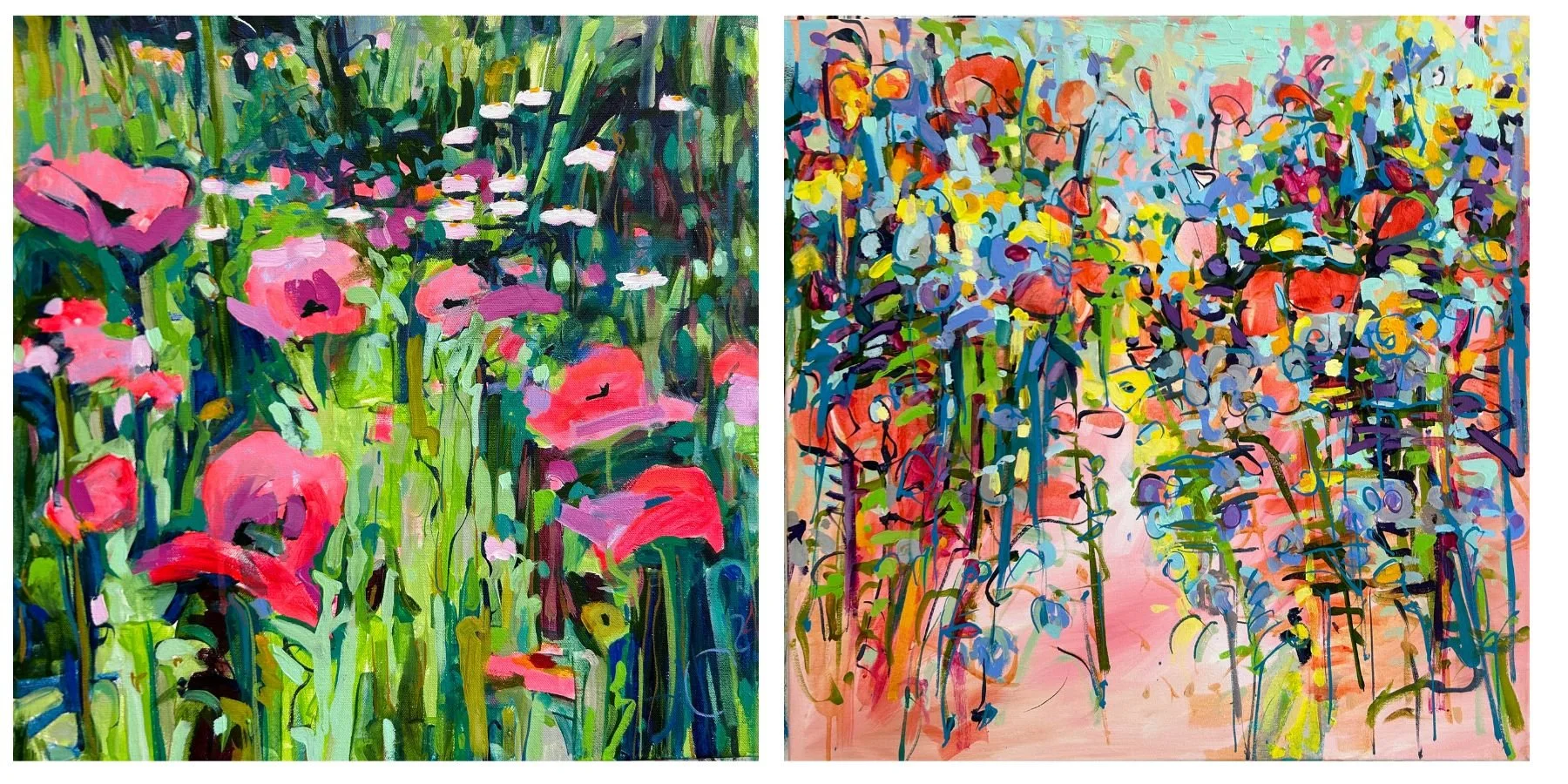 The marks I’ll intuitively make on a surface will form layers and grow to become the suggestion of a curated garden or maybe something on the wilder side. There is no formula to follow nor even any advanced drawing, but every painting does begin with a coloured underpainting. The process of underpainting is important as a physical act. It removes the hurdle of a blank canvas and gets the creative juices going. Underpainting in colour also offers an opportunity for visual reactions on the surface as layers develop.